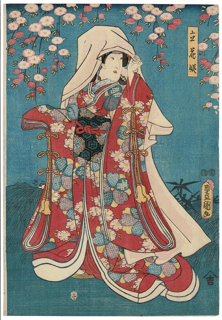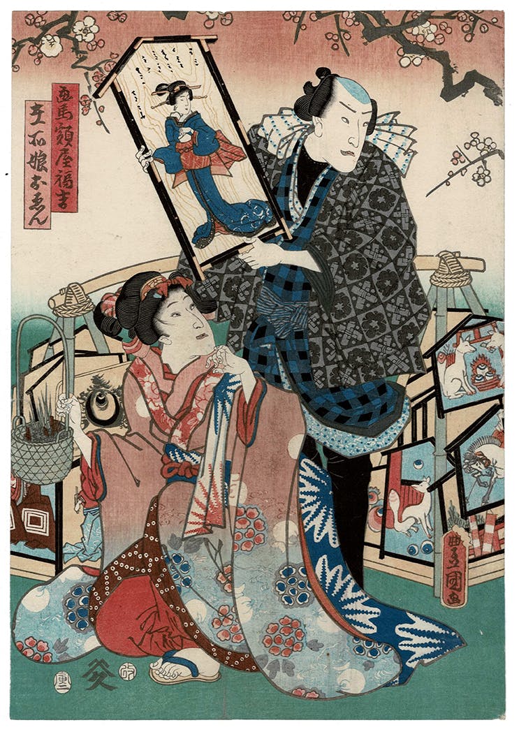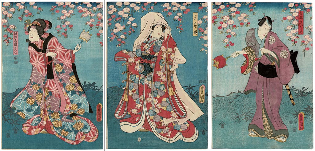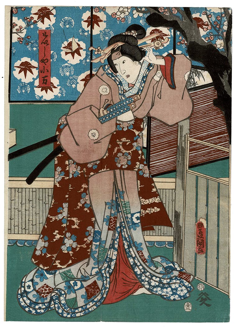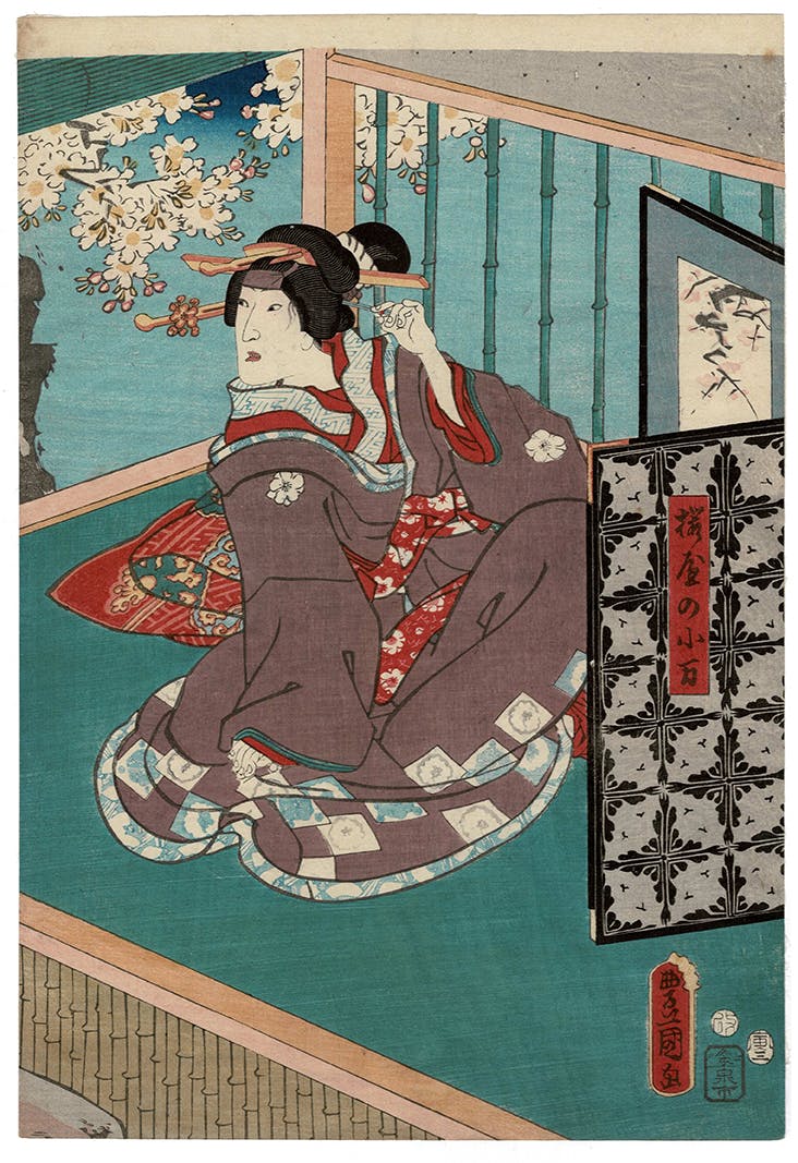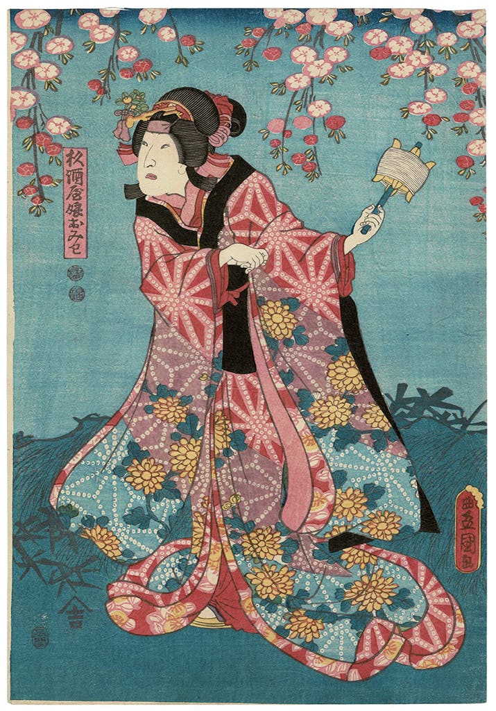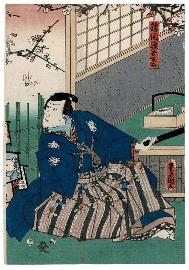 Kunisada's illustrations for the book (which was produced in a series over 13 years) became a source for numerous single sheet print projects, many of which accompanied theater productions of the Genji story (Genji Moyô Furisode Hinagata).