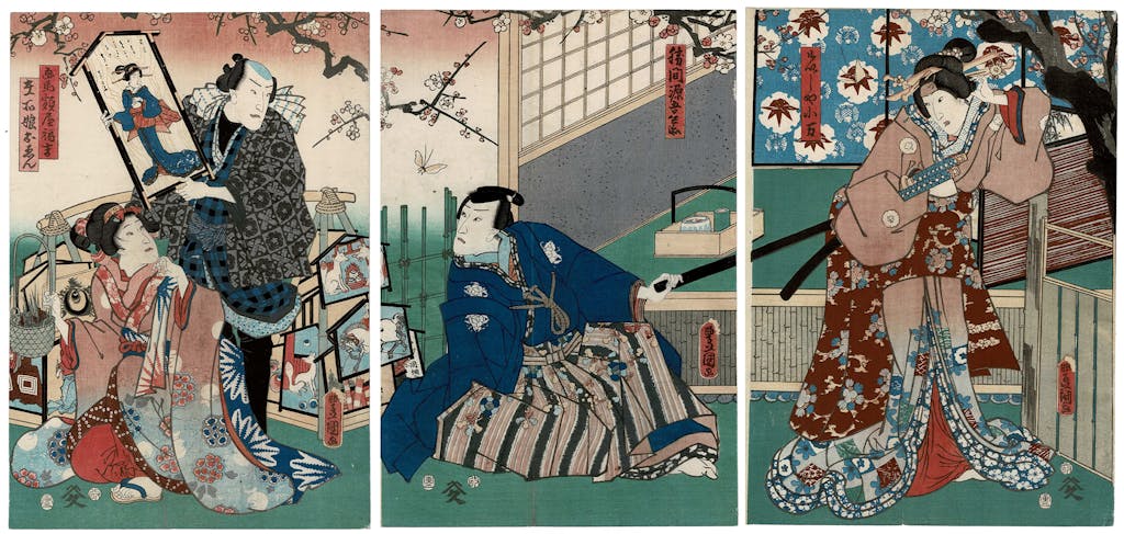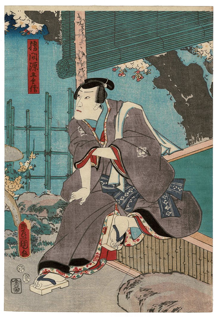 The Tale of Genji originated as an 11th century novel written by Lady Murasaki Shikibu, who worked at the Imperial Heian court. In the 1820's Kunisada collaborated with author Ryūtei Tanehiko (1783 – 1842) in the publication of an updated version of the tale: “A Fraudulent Murasaki’s Rustic Genji" by Ryūtei Tanehiko, 1829–1842), set in the 15th century. The plot of this updated version revolves around the adventures of Ashikaga Mitsuuji, second son of Ashikaga Yoshimasa, who haunts the pleasure quarters of Edo (instead of the Heian court of the original tale). Mitsuuji seeks a stolen sword, mirror, and poem, (somehow these treasures need to be found to restore the stability of Japan). While on his pursuit Mitsuuji seduces many women, has children by several of them, and though seemingly an endless philanderer always seems to come out on fine, like the original Prince Genji, fortunate and transcendent, as do his lovers and offspring.