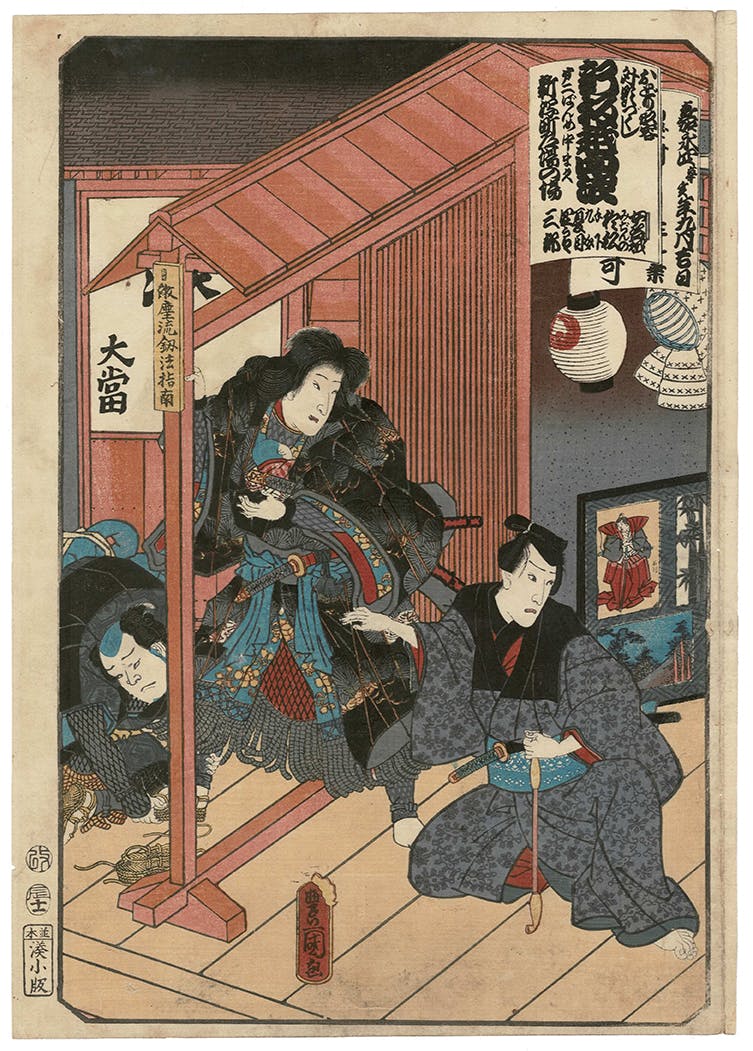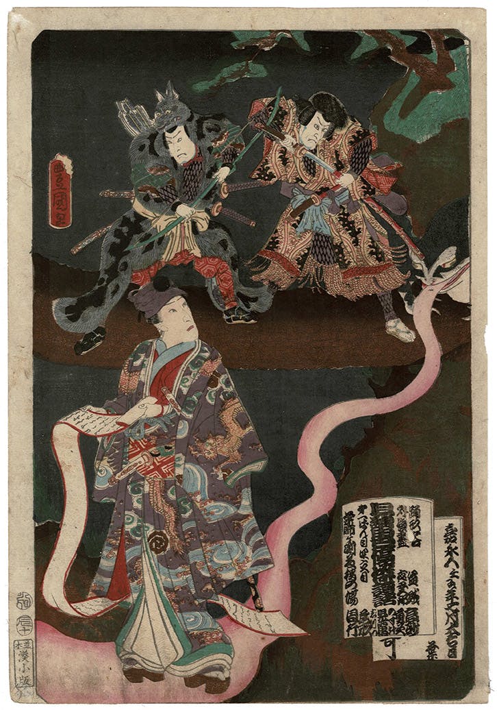 The print depicts the 3rd scene of Act IV: “The Spool of Love Travel Dance" (Michiyuki Koi no Odamaki). Danjuro VIII, in the role of Motome, attaches a spool of red thread to Princess Tachibana's kimono to be able to follow her home following a night-time visit. Omiwa, Motome's lover, does the same, attaching a spool of white thread so she can follow Motome. All three end up at the palace of Iruka, and its then that the sparks fly. Omiwa loses her life, but somehow gains immortality by supplying blood which, in a convoluted way we can't figure out, allows for the overthrow of Iruka and his grasp on power. (More research needs to be done on this story, for sure.)