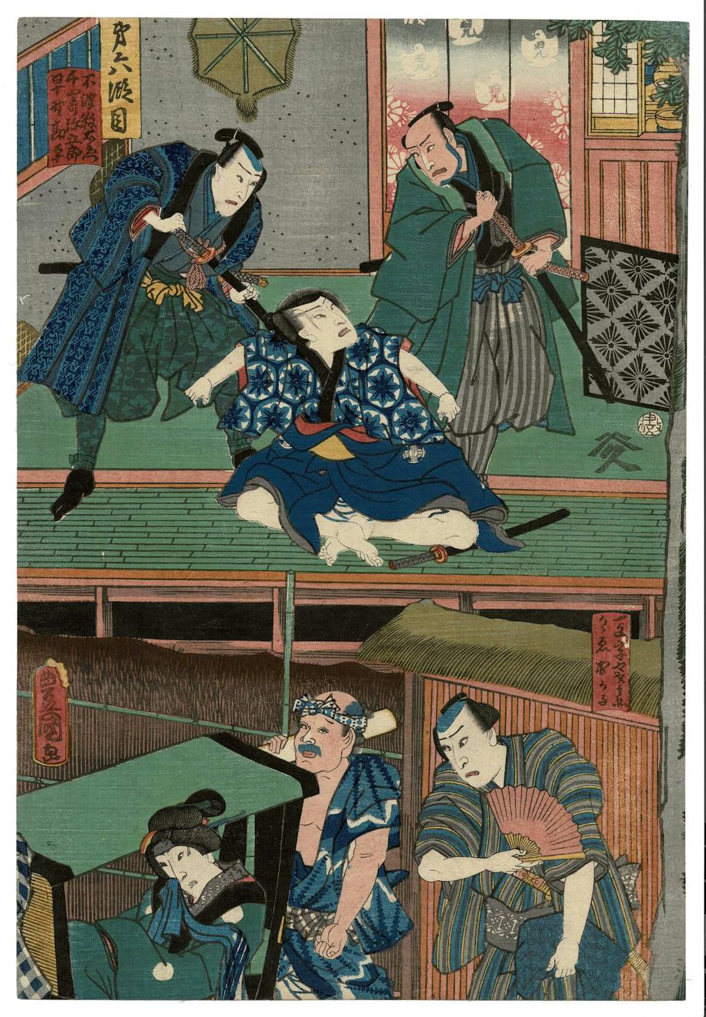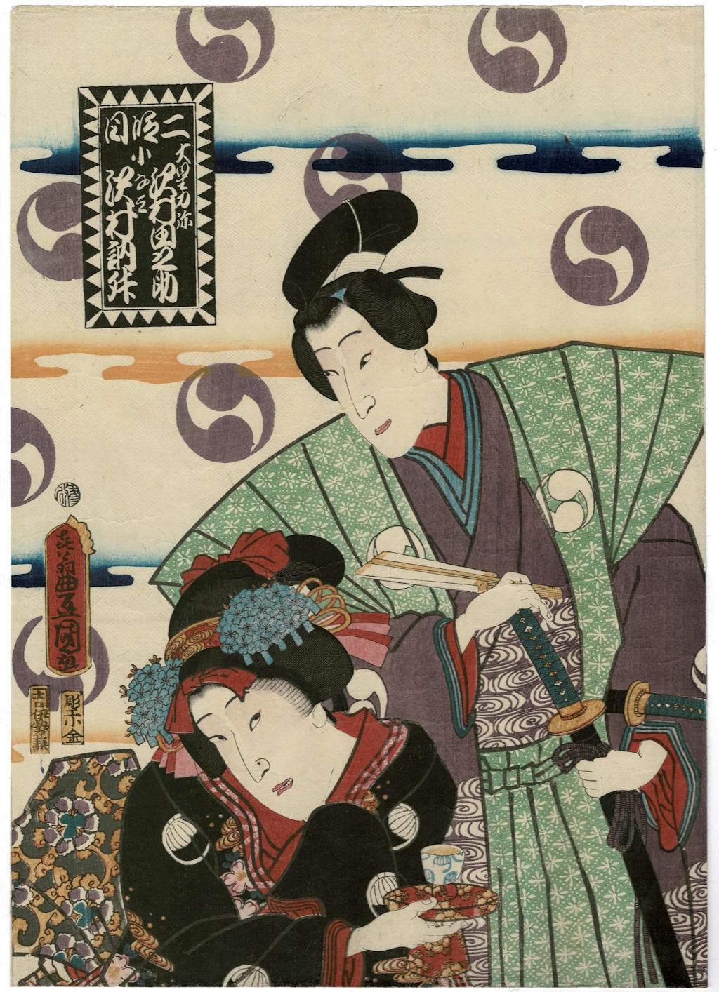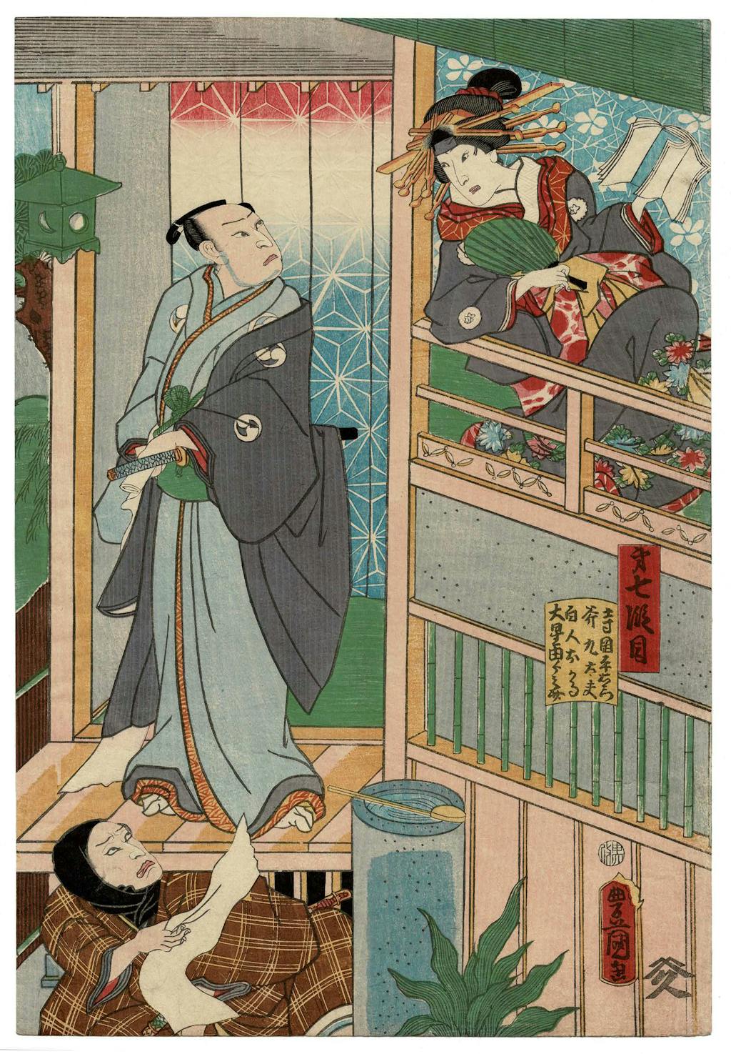 In the middle is the symbol of the Asano rōnins. This image, something like a revolving yin and yang, is used by Kunisada and numerous other print designers of the middle of the 19th century to indicate imagery of the Chushingura. Print designers, Kunisada particularly, also used the image of jagged diagonals, in borders, in clothing patterns, in compositional arrangements, to indicate Chushingura imagery.