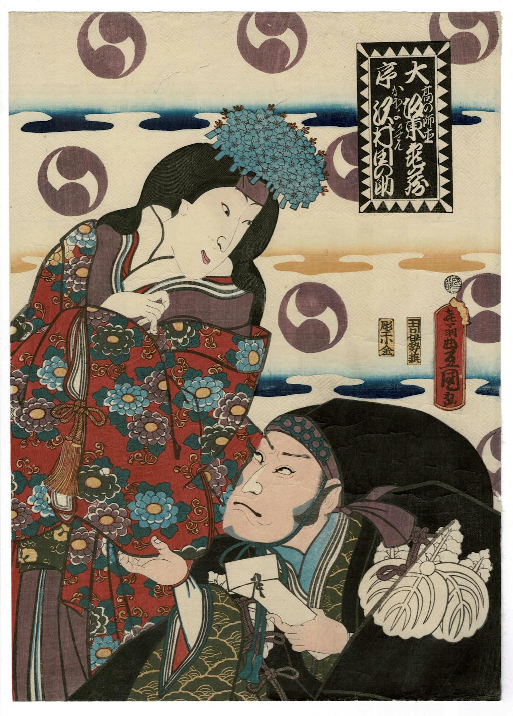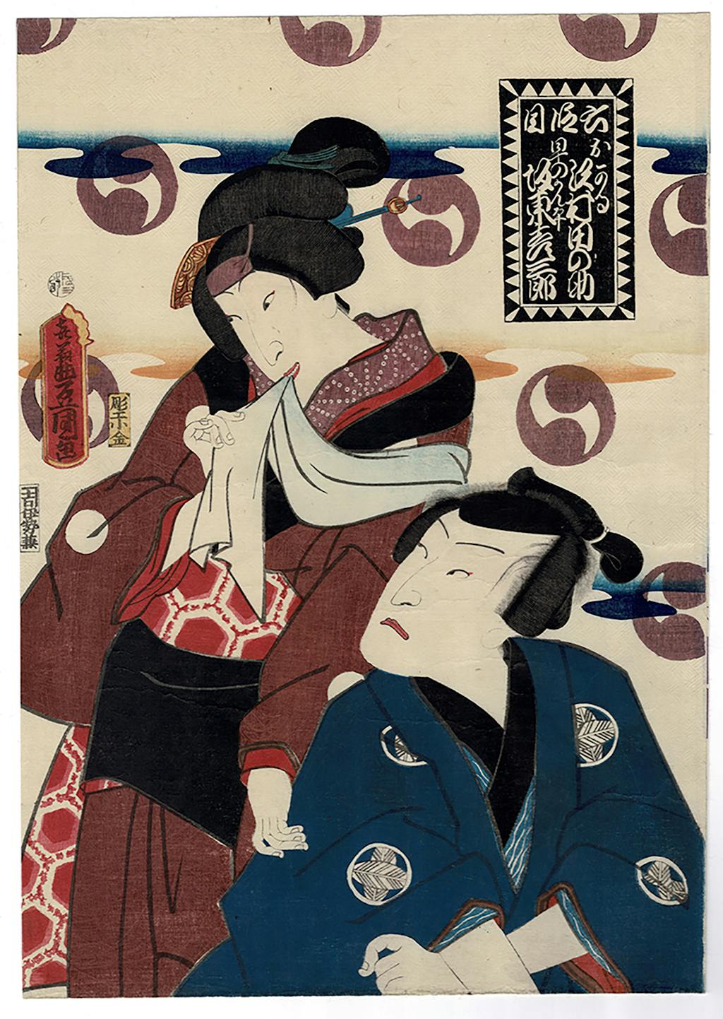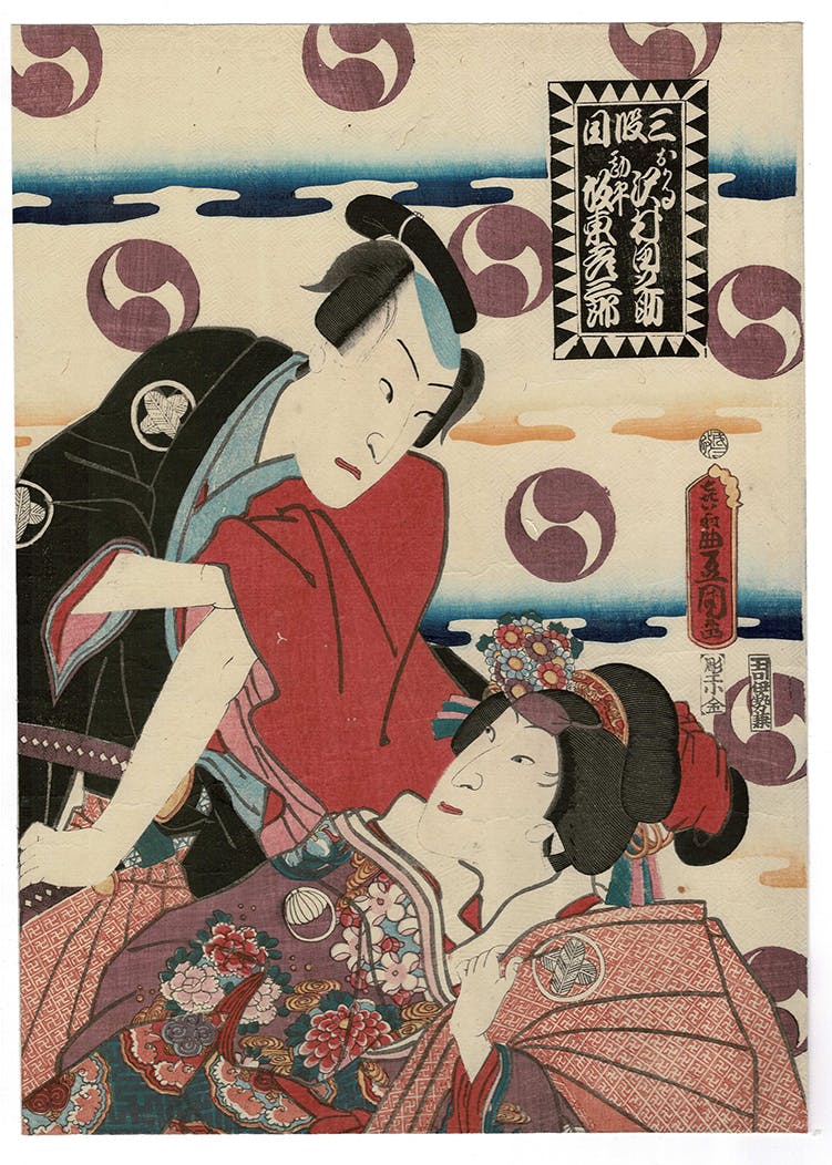 In the middle is the symbol of the Asano rōnins. This image, something like a revolving yin and yang, is used by Kunisada and numerous other print designers of the middle of the 19th century to indicate imagery of the Chushingura. Print designers, Kunisada particularly, also used the image of jagged diagonals, in borders, in clothing patterns, in compositional arrangements, to indicate Chushingura imagery.