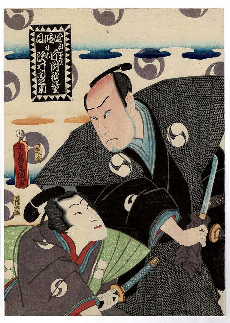 On the right is the mon crest of the Wakanosuke clan. Hangan and Wakanosuke were friends and various of Wakanosuke's samurai followers are involved in the vendetta in Chushingura play.