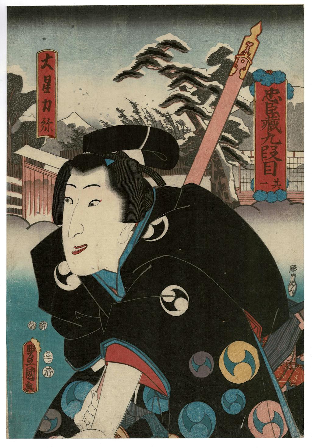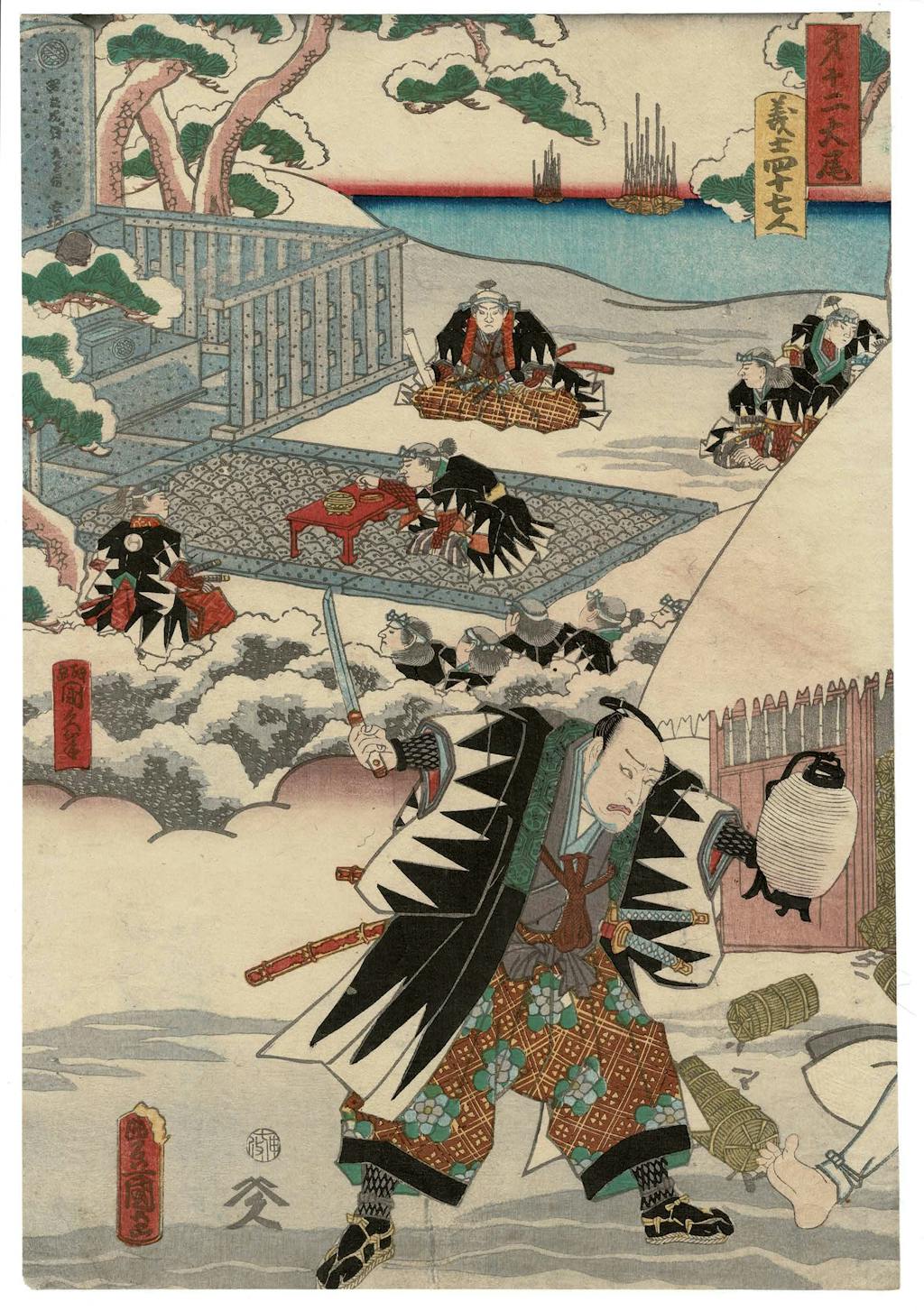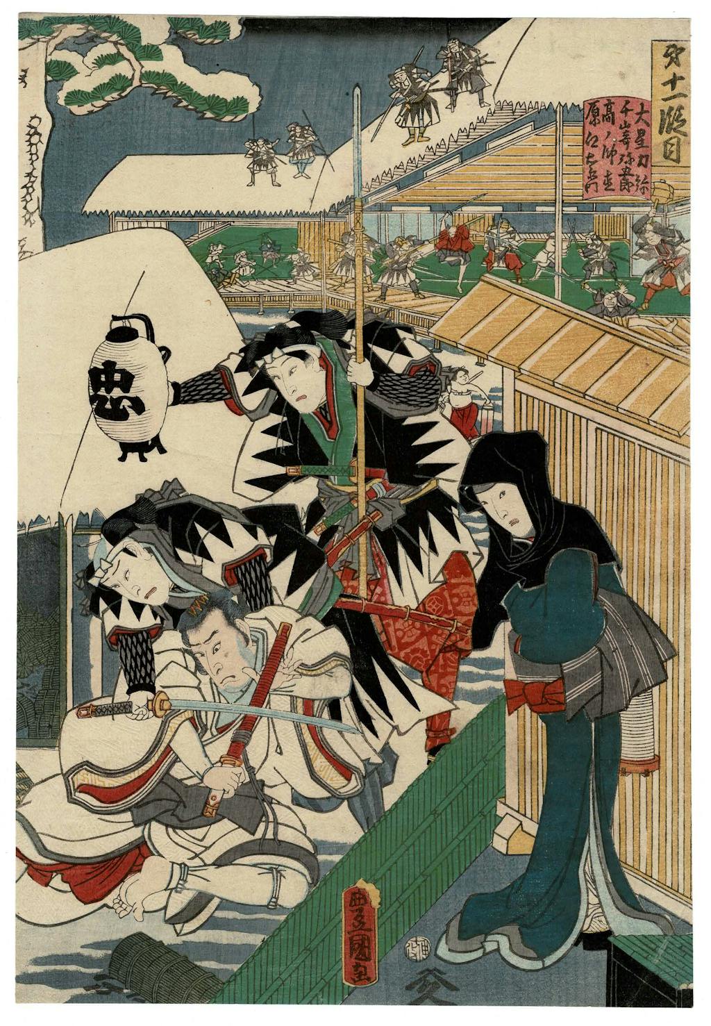 The exhibit's feature is a full narrative set of twelve prints, laid out as four triptychs, designed by Kunisada (after 1848 known as Toyokuni III) in 1860. Prints were made to depict particular actors in particular performances of Chushingura, and to depict the full narrative of the play. This is one of several full narrative sets that Kunisada designed over the course of his long career. Through the 19th century Chushingura became increasingly popular and relevant, the Confucian ideals of fierce loyalty it is built upon played into sentiments that eventually led to the restoration of the emperor of Japan and the end of the Tokuwawa shogunate.