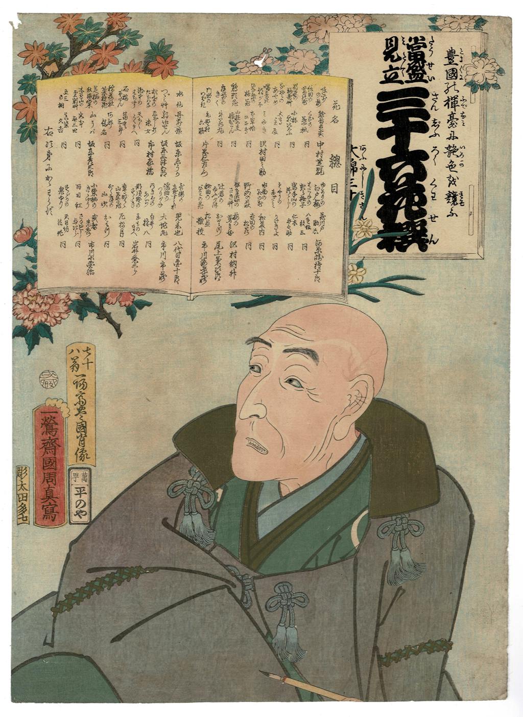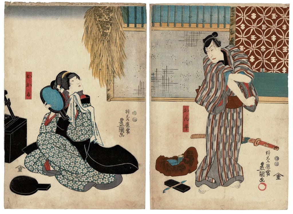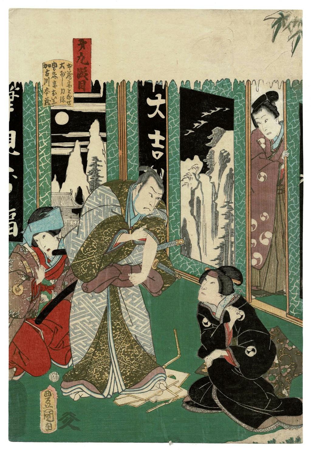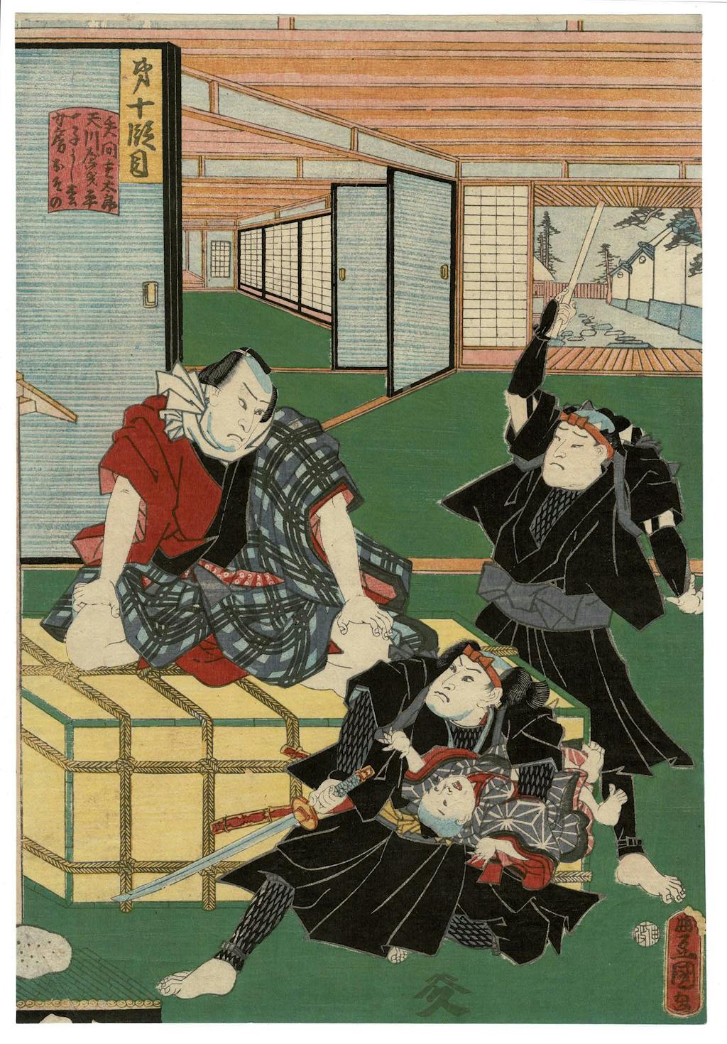 The exhibit's feature is a full narrative set of twelve prints, laid out as four triptychs, designed by Kunisada (after 1848 known as Toyokuni III) in 1860. Prints were made to depict particular actors in particular performances of Chushingura, and to depict the full narrative of the play. This is one of several full narrative sets that Kunisada designed over the course of his long career. Through the 19th century Chushingura became increasingly popular and relevant, the Confucian ideals of fierce loyalty it is built upon played into sentiments that eventually led to the restoration of the emperor of Japan and the end of the Tokuwawa shogunate.