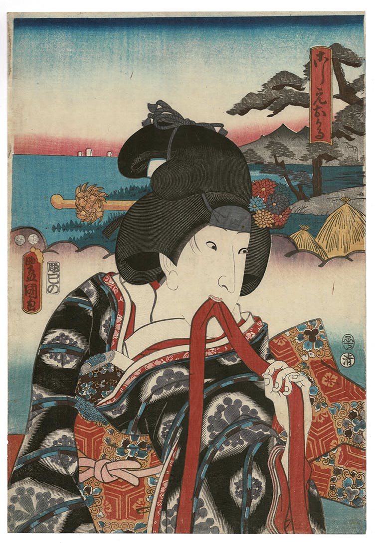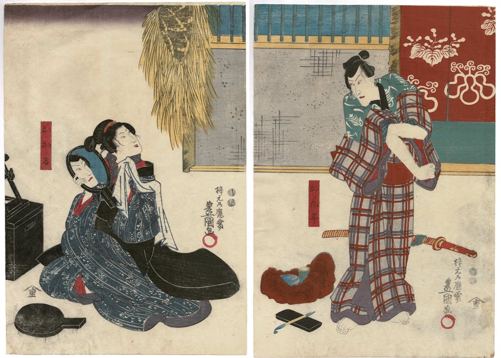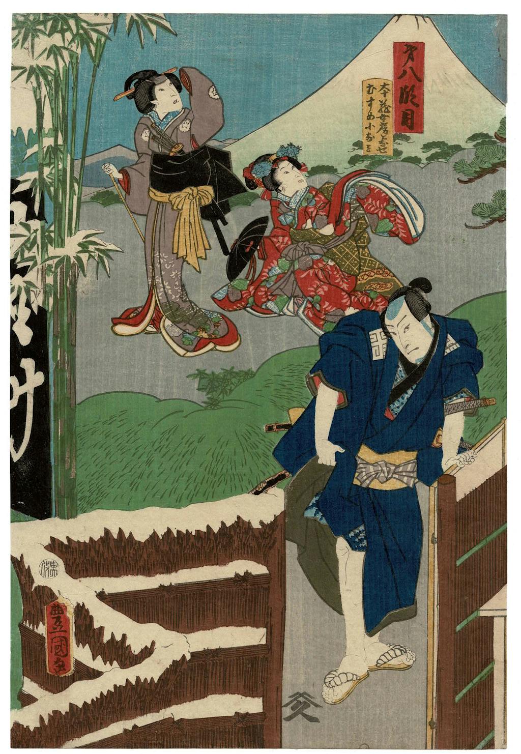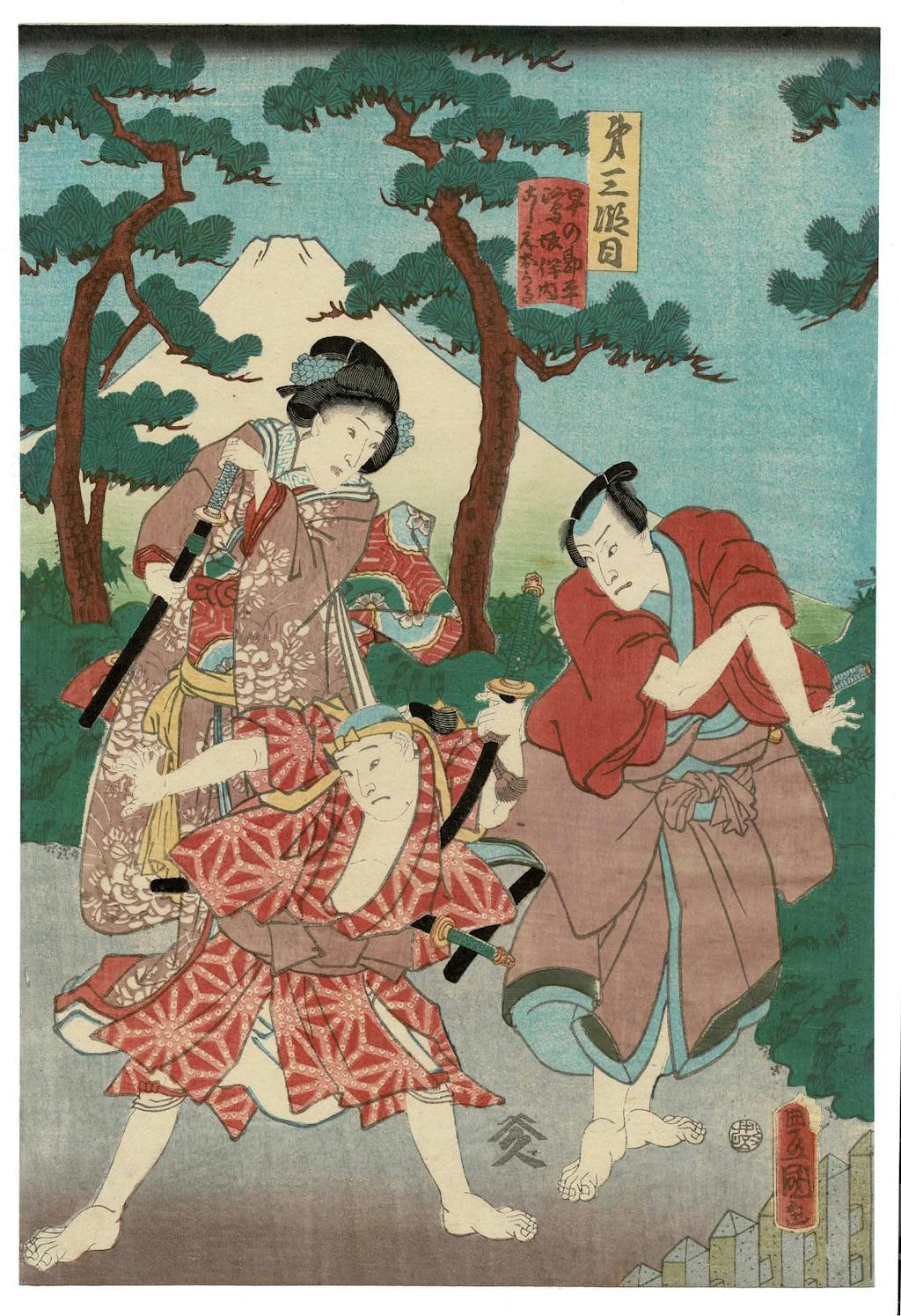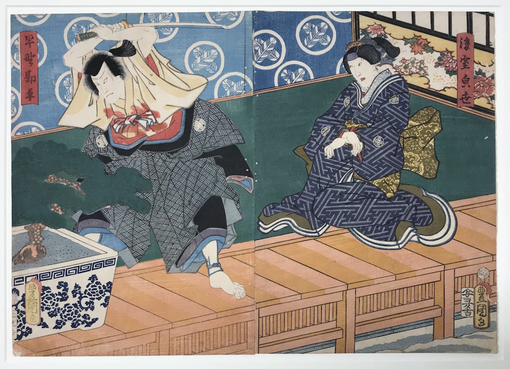 Utagawa Kunisada (also known as Toyokuni III), was recognized in his lifetime as Japan’s most successful and prolific ukiyo-e artist. Kunisada dominated the field of yakusha-e (kabuki actor prints), and he designed hundreds of prints depicting Chushingura scenes and actors. In Kunisada’s Chushingura prints are themes characteristic of his art: emphasis on movement and drama, a focus on tensions in depicted human interactions, strong formal arrangements with masterful use of pattern and color to develop dramatic pictorial spaces. The MBFA exhibit explores Kunisada’s beautiful narrative and character portrayal; it also attempts to use this art to better understand aspects of the recent event of the storming of the U.S. Capitol in Washington, DC.