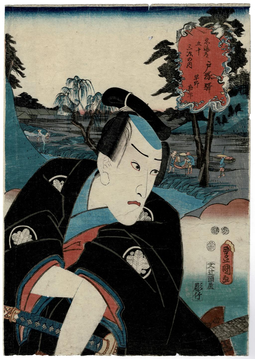 Note 4: These prints are made using the Japanese hanga method, the same technique I use to make my own art. Printed from separate carved blocks using brushes and a hand-held baren as a press, this printmaking represents an intimate and complex handcraft. I am fascinated by what it took to make them: multiple teams each pursuing various parts of their manufacture. Publishers, involved also in sales and distribution, managed the production of the prints. They were likely sophisticated business people managing what was one of the largest industries in Edo (a city which at the time was among the largest cities in the world). Publishers worked with artists to develop the designs (Kunisada had numerous artists working with him in his design shop). These publishers utilized separate craftspeople, the block-cutters, to develop the blocks. They would have taken the design sheets from Kunisada's shop to the block-cutters. Block cutters utilized impressive carving skills to interpret the drawn lines of the artist(s). Those fine strands of hair and the delicate kanji labeling? They were all carved from cherry wood blocks. Publishers then would have taken the blocks to the print shops which employed printers working seated at low benches. Using for materials only paper, water, rice paste, and pigments, and for tools just brushes and barens, the printing was done entirely by hand, block by block, color by color, sheet by sheet. These printers would, likely with color input from Kunisada himself or some of his assistants, make, dry, and trim the prints to return to the publishers ready for sale. The prints include censor's seals and labeling to indicate the various makers of the print, the designer, the block-cutter, the printer and the publisher along with indications of the print's story: the play, the character portrayed, the series it was part of and more. Actor's names, interestingly, were for much of the period forbidden to be shown on the prints.