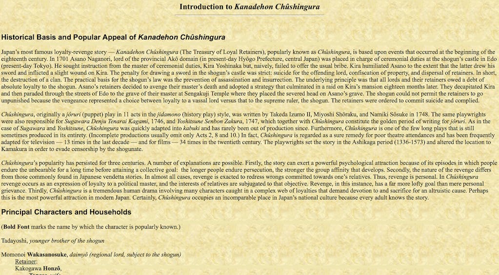 The facts of the actual historical event which took place in 1701/02 are murky. Asano Naganori (Enyan Hangan in the Chushingura) initiated a violent action of some sort against Kira Yoshinaka, a Tokugawa government official (Ko no Morono in the play), in the palace of the shogun during a state ceremony. This brought disaster to his house of Asano. For his misstep he was required to take his own life by seppuku (harikari, self disembowelment) that same day, lands and properties were confiscated, and his several hundred samurai followers became master-less unemployed men known as rōnin. The play revolves around the intrigue of 47 of these rōnin who chose to pursue a secret vendetta to finish the assassination their master initiated. Under the leadership of Ōishi Kuranosuke Yoshio (Oboshi Yuranosuke in the play) the intrigue climaxes with a night-time raid on the house of Kira on Dec. 14, 1702. The rōnin behead Kira, carry his head through the city of Edo to the Sengakuji temple where Asano's ashes had been interred, and turn themselves in. It seems there is popular support for the rōnin and it takes three weeks for the shogun to decide their fate. He requires, or offers, these rōnin the opportunity to take their own lives by honorable seppuku rather than be executed as common criminals. The 47 all commit seppuku and are currently interred in a set of revered graves at the Buddhist Sengakuji temple in Tokyo.